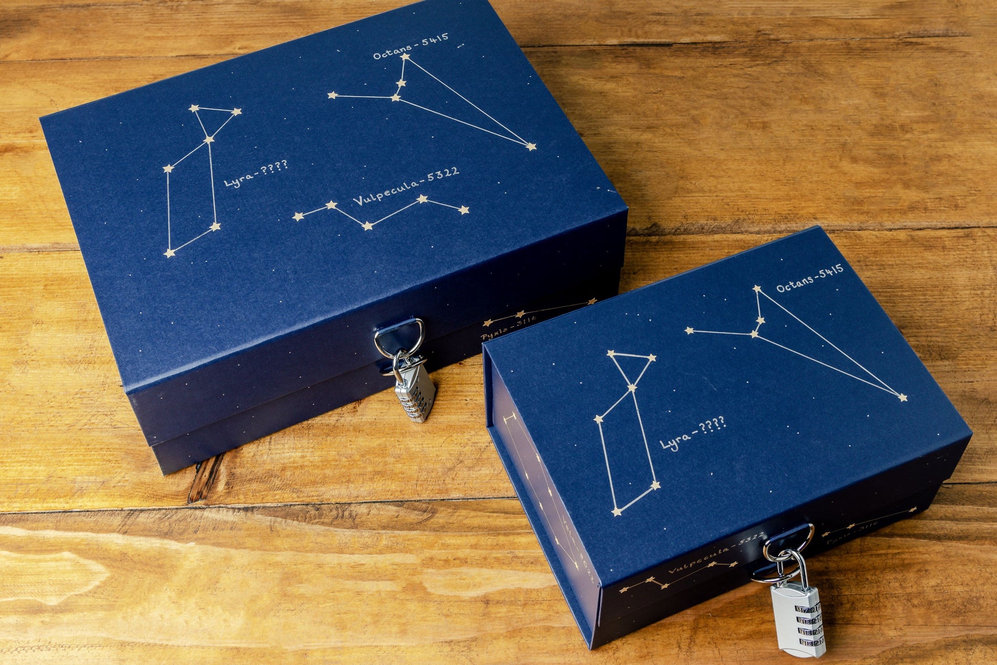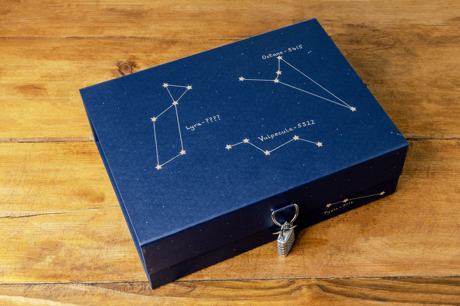 Recipients must decipher the secrets of the stars to discover the combination and open the box. The quick puzzle, which takes about 10-15 mins, is contained entirely on the outside of the hand-decorated box.