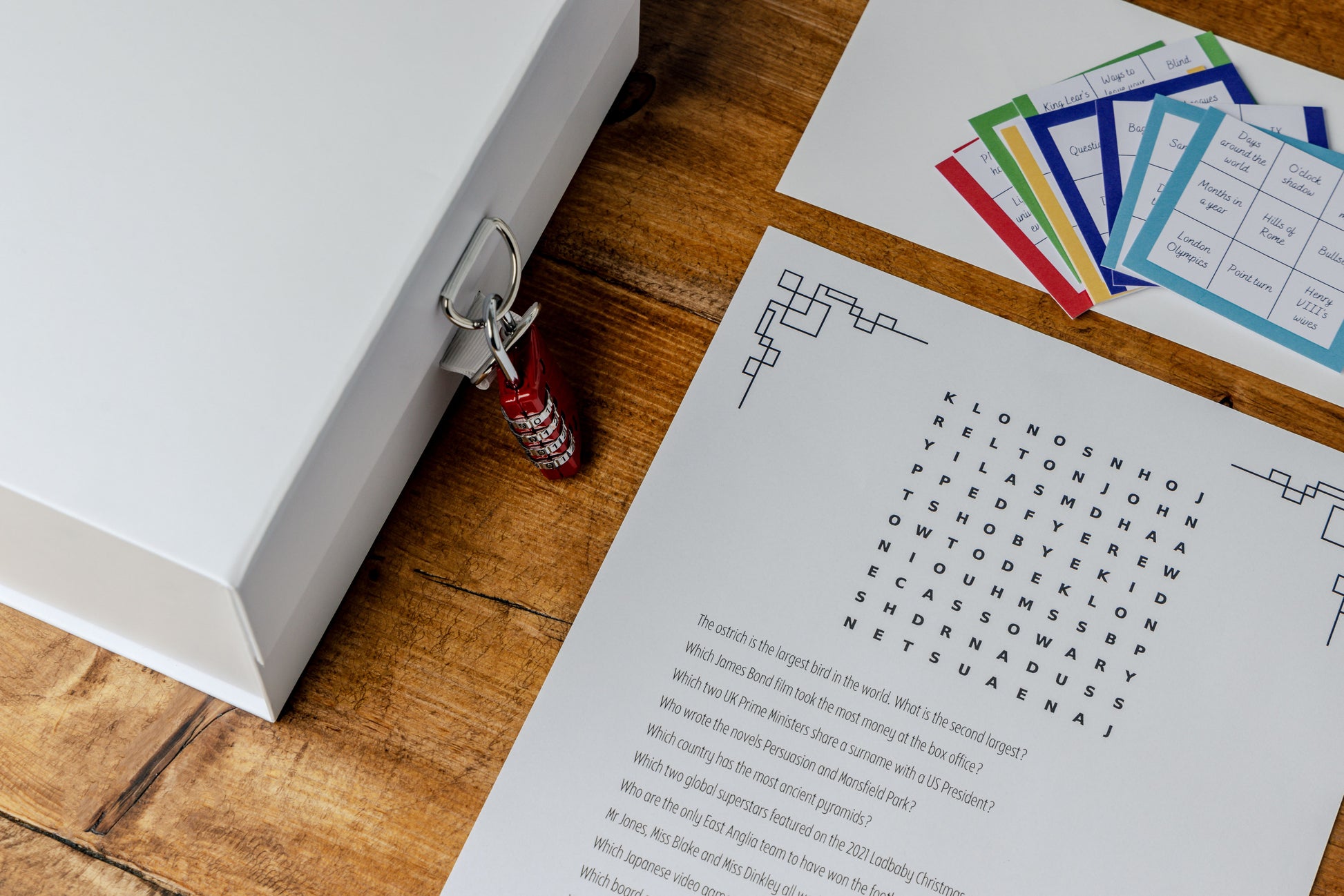 The puzzle wordsearch includes a series of general knowledge questions. There is an option to personalise this element of the puzzle with the Ivy Box Personalisation add-on.
